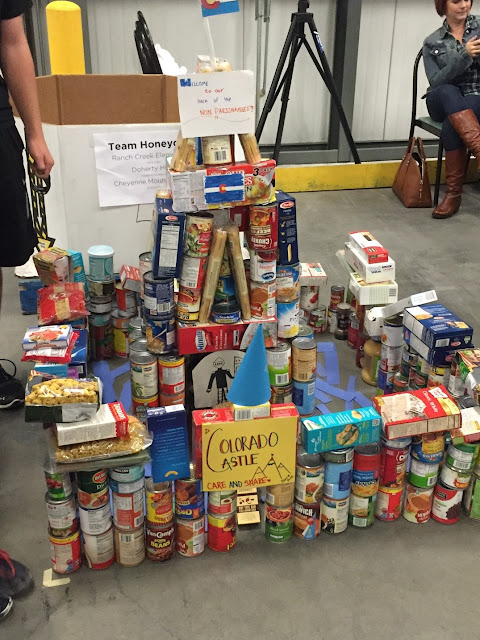 Yesterday, we kicked off Harvest of Love with an awesome event-our second annual Canstruction. Participating schools (Scott, Janitell, Doherty, Jenkins, Cheyenne Mountain, Stetson, Palmer, Ranch Creek, and Pine Creek) were in competition to make the most awesome structure out of cans.