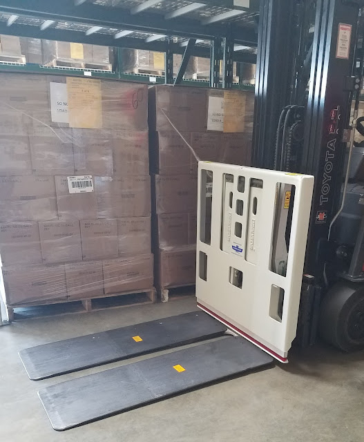 Sometimes, we receive pallets of food that are stacked too high to fit on the racks in our distribution center. When this happens, our staff and volunteers spend extra time unstacking the food until it is short enough to fit on our shelves. Our new pallet down stacker will work like a giant spatula attached to a forklift, so we can take off all of the extra layers of product at one time instead of needing multiple people to move individual items or boxes off a pallet.