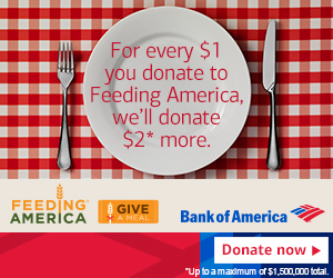 If you can’t volunteer, one option is to donate to the Give A Meal program, a Feeding America program supported by Bank of America that extends the impact of individual donations. For every $1 donated, until the end of the year, the Bank of America Charitable Foundation will donate $2 to support Feeding America and its network of food banks.