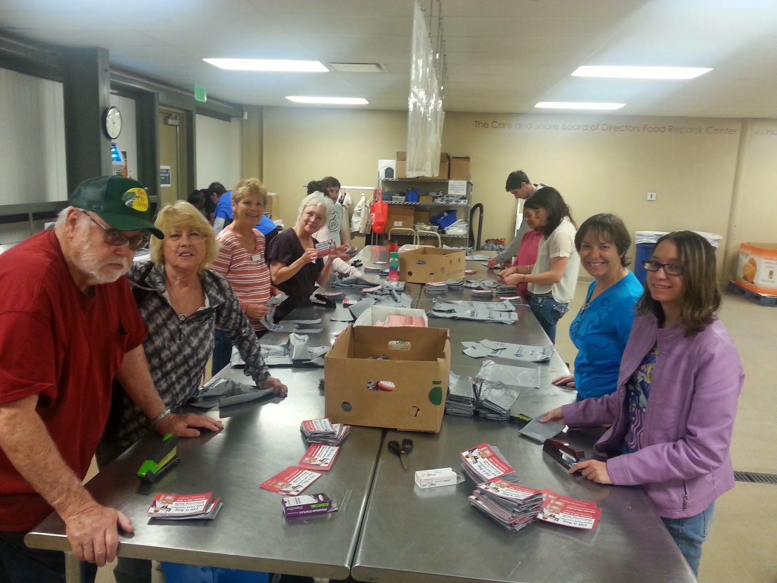 In order to prepare for this event, these wonderful volunteers stapled 10,000 plastic bags to Stamp Out Hunger postcards. Your letter carrier will put either these plastic bags, brown paper bags, or a post card in your mailbox today or tomorrow as a reminder to participate.